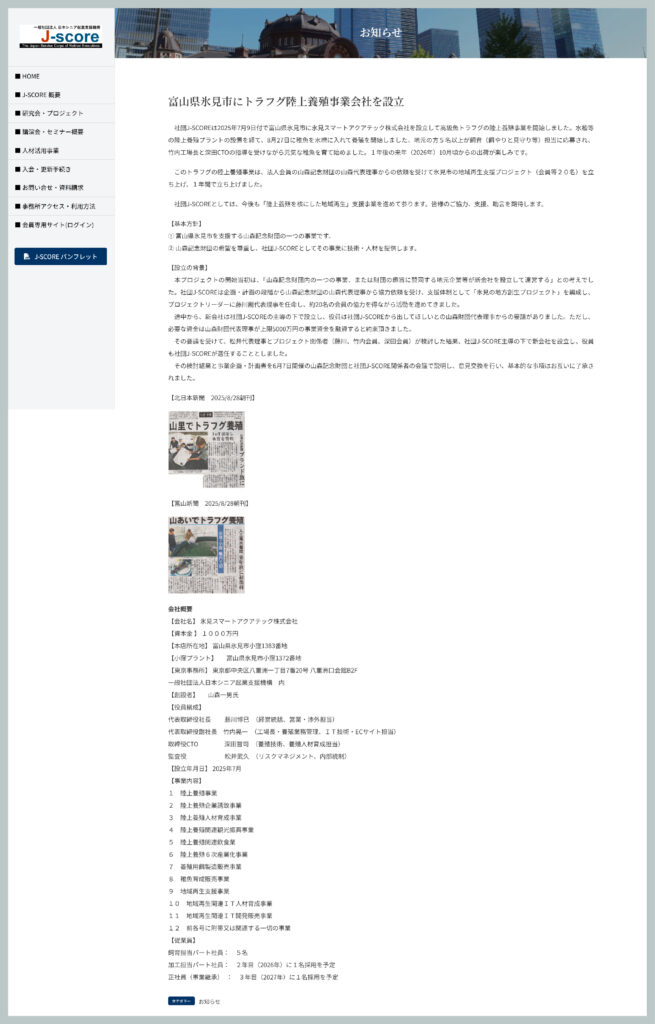 一般社団法人 J-SCOREは、2025年7月9日付で設立、高級魚トラフグの陸上養殖事業を開始したと発表致しました。北陸を中心に各種メディアでも取り上げられ期待が高まっています。J-SCORE公式サイト内でも告知されています。